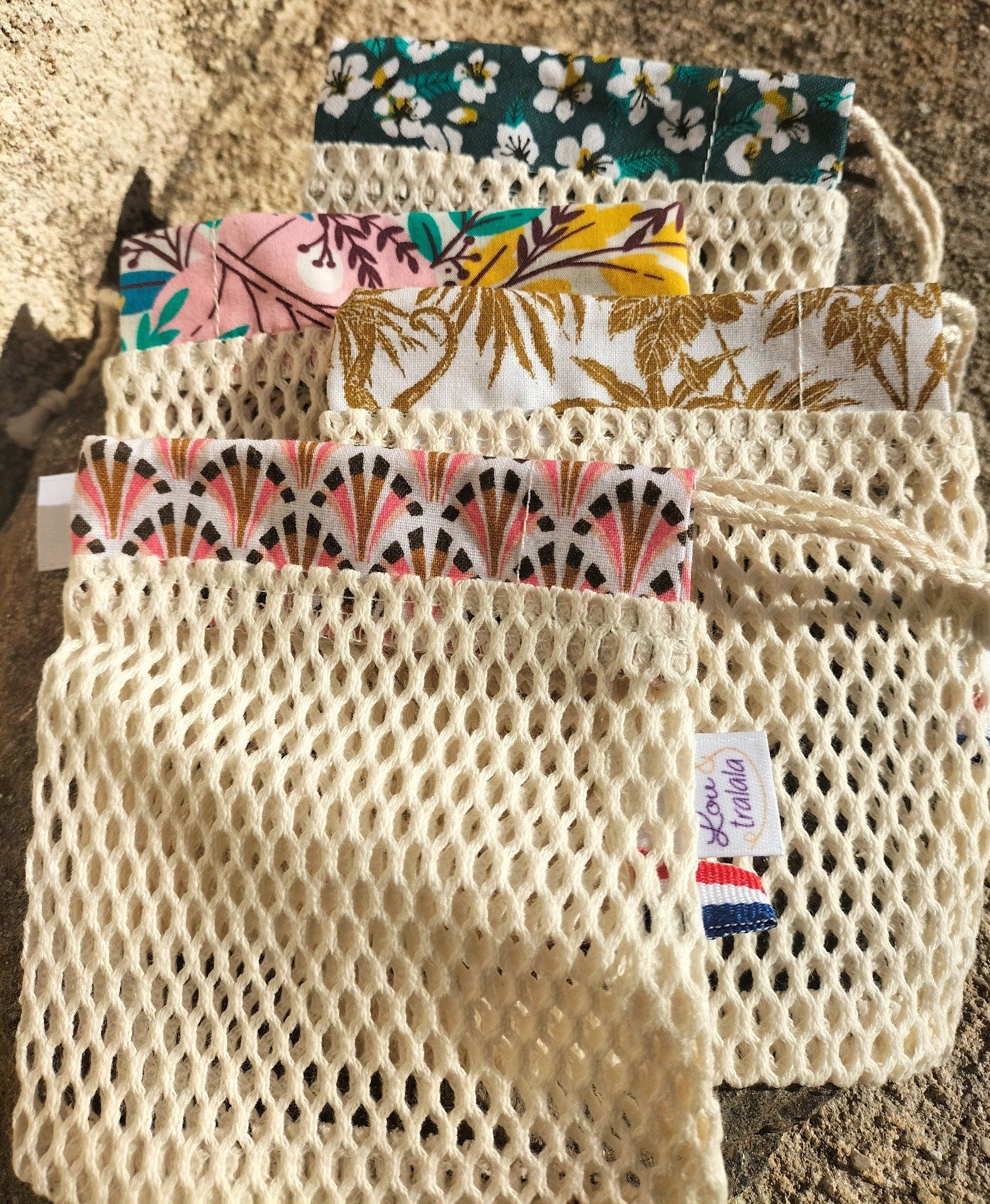 Filet en coton certifié bio fabriqué en France, la pochette sauve-savon est un accessoire zéro déchet très utile.